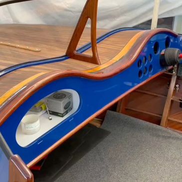 Built in San Diego in 1981 by Knight and Carver. The original owners wanted a wonderful styled boat and this replica of the Riva Aquarama was built. It’s a very seaworthy and proven hull for those looking to build a large offshore runabout for friends and family. The original owners had let the boat decline and the current owner had started to re-do the deck. Moving the dash aft about 18”, and then after re-skininning the deck with Luan and West System to boat layed dormant for about 20 years. Always wanting to revive its glorious beauty he hired Glenn Styron to bring her back, the restoration process has been carefully crafted. A new teak deck, hull paint, and lots of masterfully detailed features have been incorporated. (* the top image is a Carbon strut that helps support the composite hard top - that consists of Coosa Board, Kevlar and carbon reinforcements ) New upholstery and electrical, a finely tuned 454 engine are all part of this elegant and powerful craft. LINK - Progress Videos